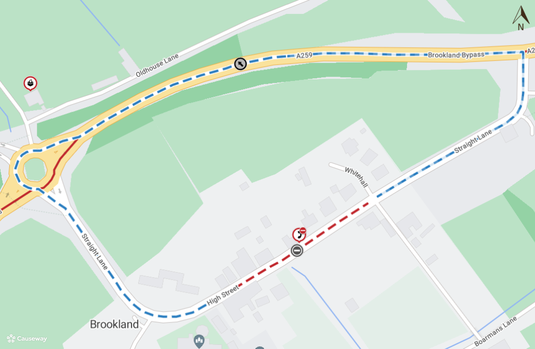 The alternative route for any through traffic is via High Street, Lane From High Street To A259 Rectory Lane Roundabout, A259 Rectory Lane Roundabout, A259 Brookland Bypass, Straight Lane and vice versa.