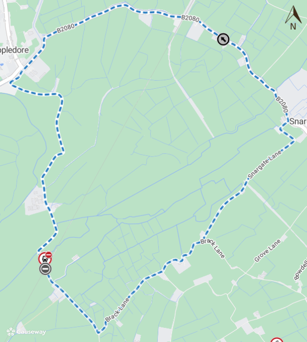 The alternative route for any through traffic is via Beckett Road, B2080 Station Road, B2080 Rhee Wall Road, Snargate Lane, Brack Lane and vice versa.