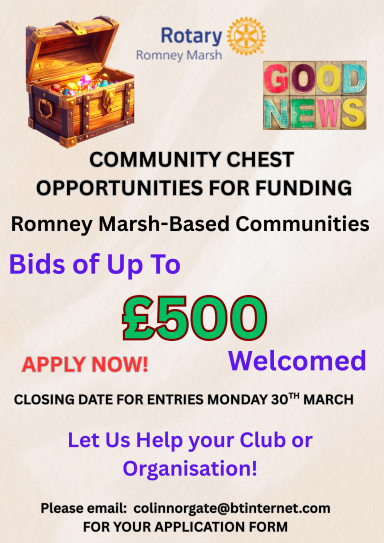Romney Marsh Rotary Club have launched their Community Chest funding programme designed to help local organisations across the Romney Marsh area who may need financial support. Bids of up to £500 are welcomed. Closing date for entries Monday 30th March. Email for application form colinnorgate@btinternet.com