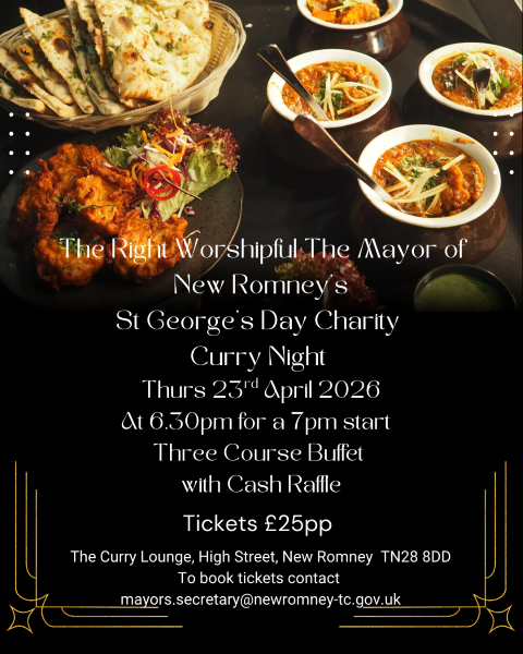 The Right Worshipful the Mayor of New Romney is holding a St George's Day Charity Curry Night at The Curry Lounge, High Street, New Romney, on Thursday 23rd April at 6.30pm for a 7.30pm start. Three course buffet with a cash raffle. Tickets £25pp.